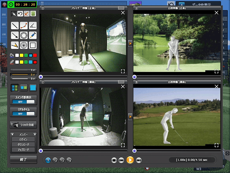 正面・後方の2画面で撮影。修正前、修正後の画像の入れ替えやコンピューターグラフィック映像とのスイング比較ができます。